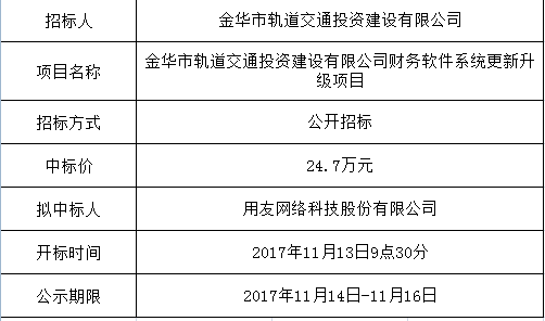金華市軌道交通投資建設(shè)有限公司財(cái)務(wù)軟件系統(tǒng)更新升級項(xiàng)目中標(biāo)公示