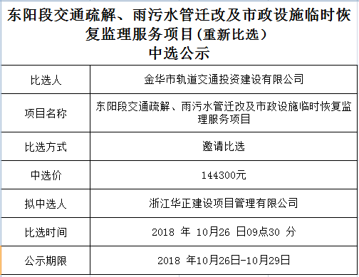 東陽段交通疏解、雨污水管遷改及市政設(shè)施臨時恢復(fù)監(jiān)理服務(wù)項目(重新比選)中選公示